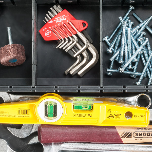 The freely arrangeable bottom tray makes for adaptable space to stow away small parts and bulky tools. The case comes with cross and length dividers to provide flexible storage options like no other. This way, tools and working equipment of any trade such as electrics, sanitary or carpentry find their proper place – and allows individual arrangement of your tools, from small screws to large tools.